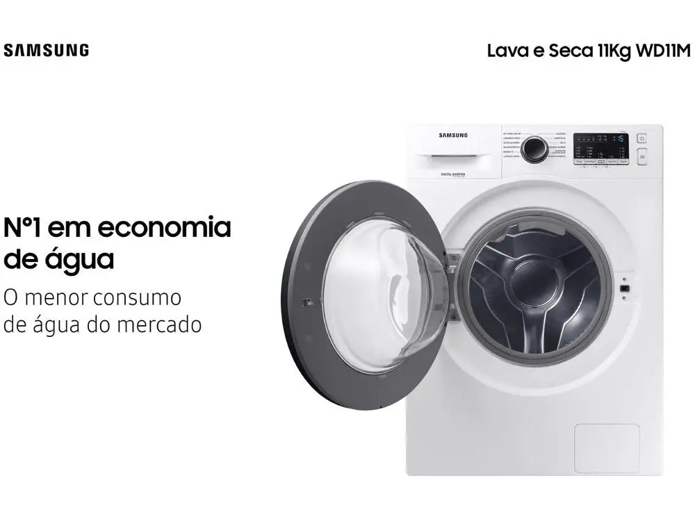 For you who are looking for your new washer, you need to know the Wash and Dry Samsung WD11M4473 White. It has washing capacity of 11kg and drying capacity of 7kg, digital inverter motor that is quieter and with 10 years of warranty, in addition to 12 washing programs. It's The No. 1 in water saving, has features like 3 in 1 that washes, dries and dry sterilizes, washes in 15 minutes and washes and dries in 59 minutes so you don't bother to hang out clothes on the clothesline. And yet, it uses hot and cold water and has a digital control panel.